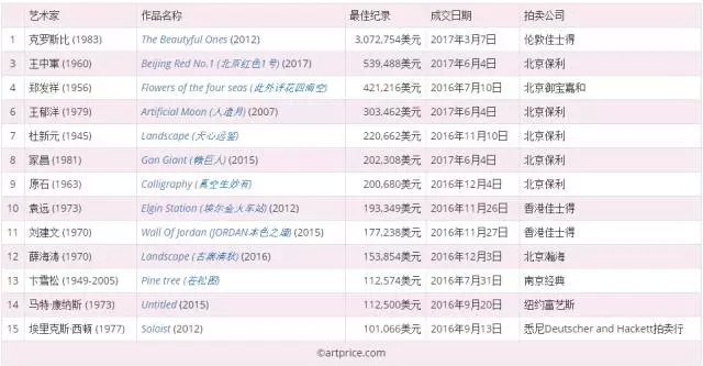 #Artprice公布2017年度当代艺术市场报告,拍卖市场首秀成交榜单王中军排名第二#